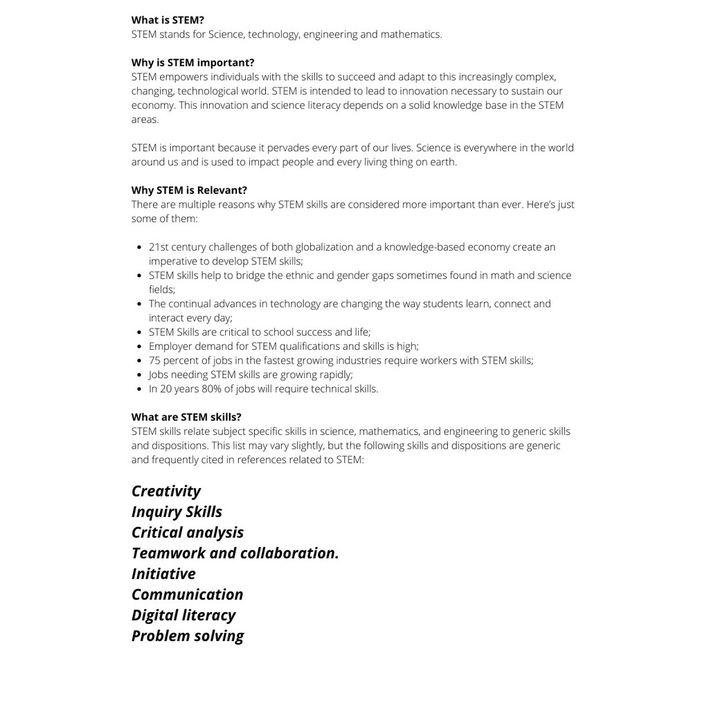 STEM skills relate subject specific skills in science, mathematics, and engineering to generic skills and dispositions. This list may vary slightly, but the following skills and dispositions are generic and frequently cited in references related to STEM: