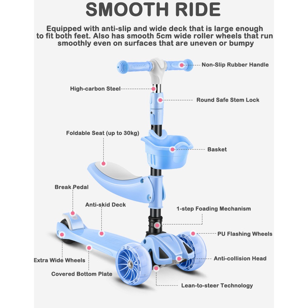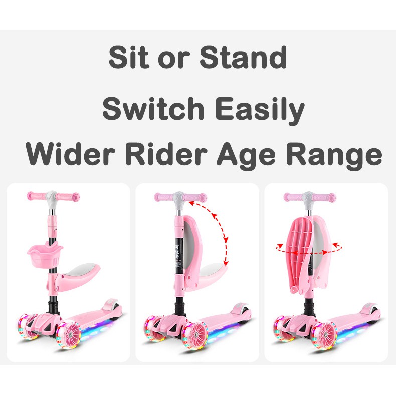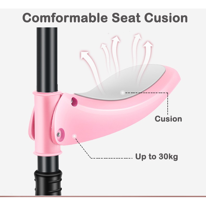 • SIT OR STAND DESIGN WITH FOOT REST: This scooter for toddlers is equipped w/ a unique 30kg capacity removable flip-out seat which kids can use while cruising along with the built-in foot pad. Can be detached when they feel more confident standing up