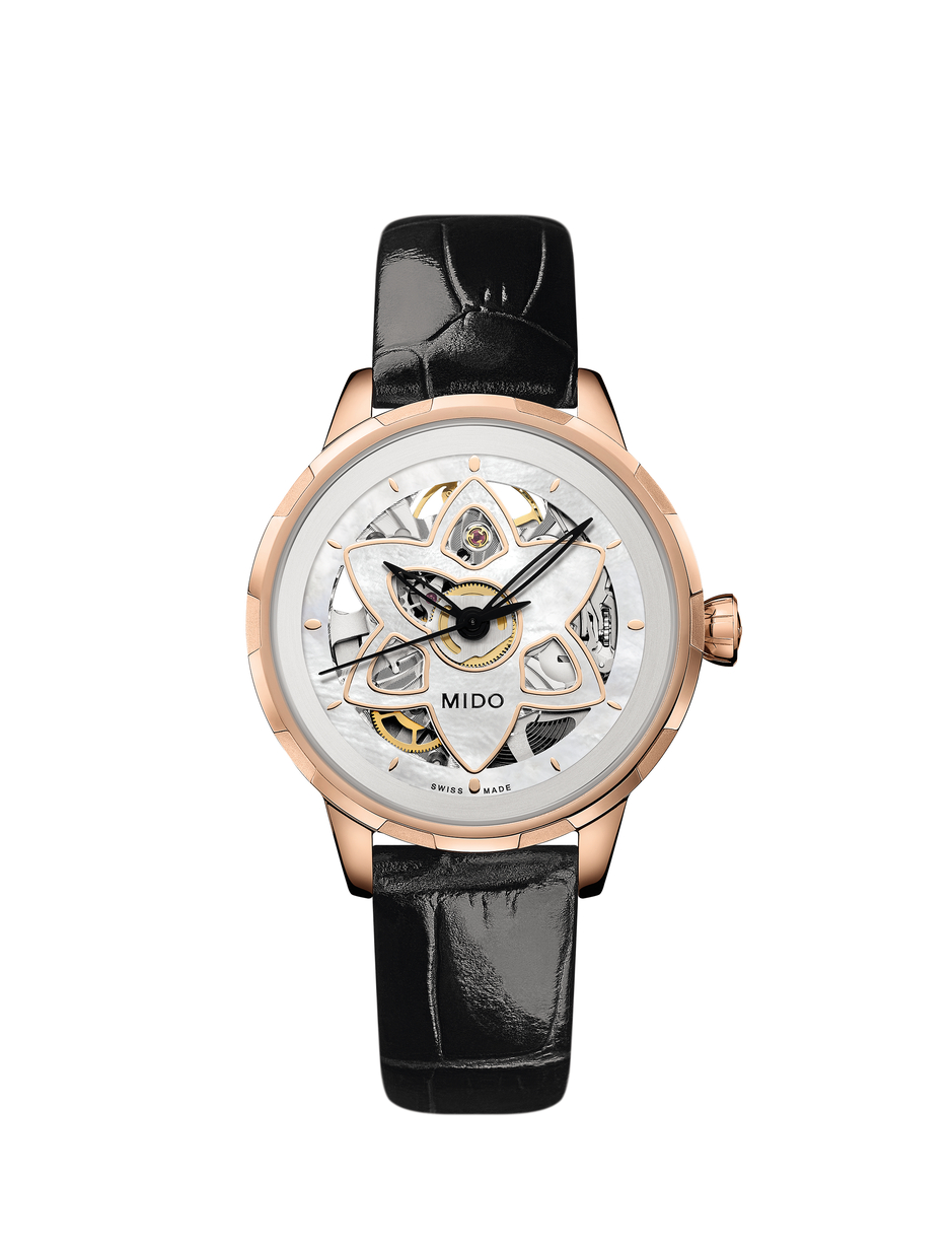For the first time, Mido has created a skeleton Swiss watch especially dedicated to women. The new and audacious Rainflower Blossom features delicate lines, directly inspired by the lotus flower shape of Singapore’s contemporary ArtScience Museum. Resolutely feminine petals are interlaced along the edges. Adorned with an openwork flower, the captivating dial reveals at its centre the Caliber 80 – the latest-generation automatic movement, whose mainplate has been specially skeletonised and decorated. It invites the wearer to marvel at the passing of time with audacityand elegance.