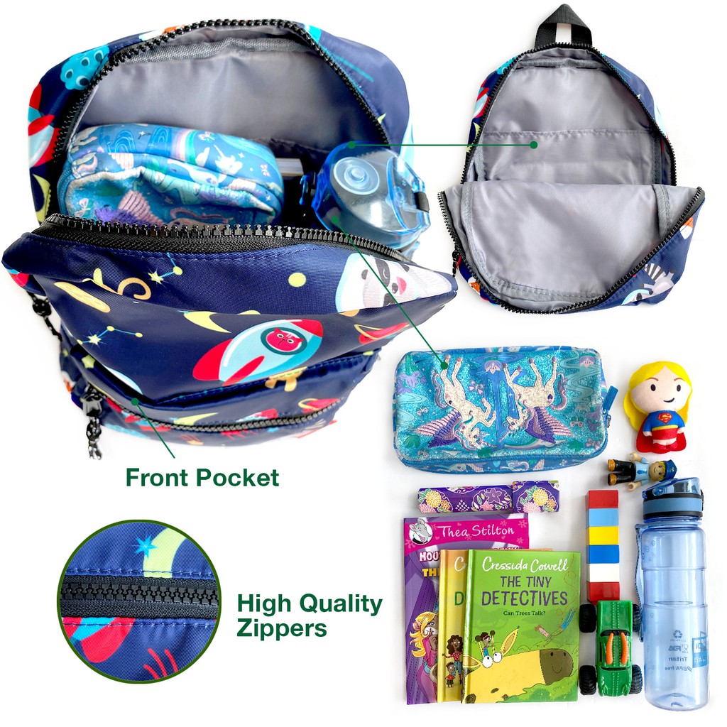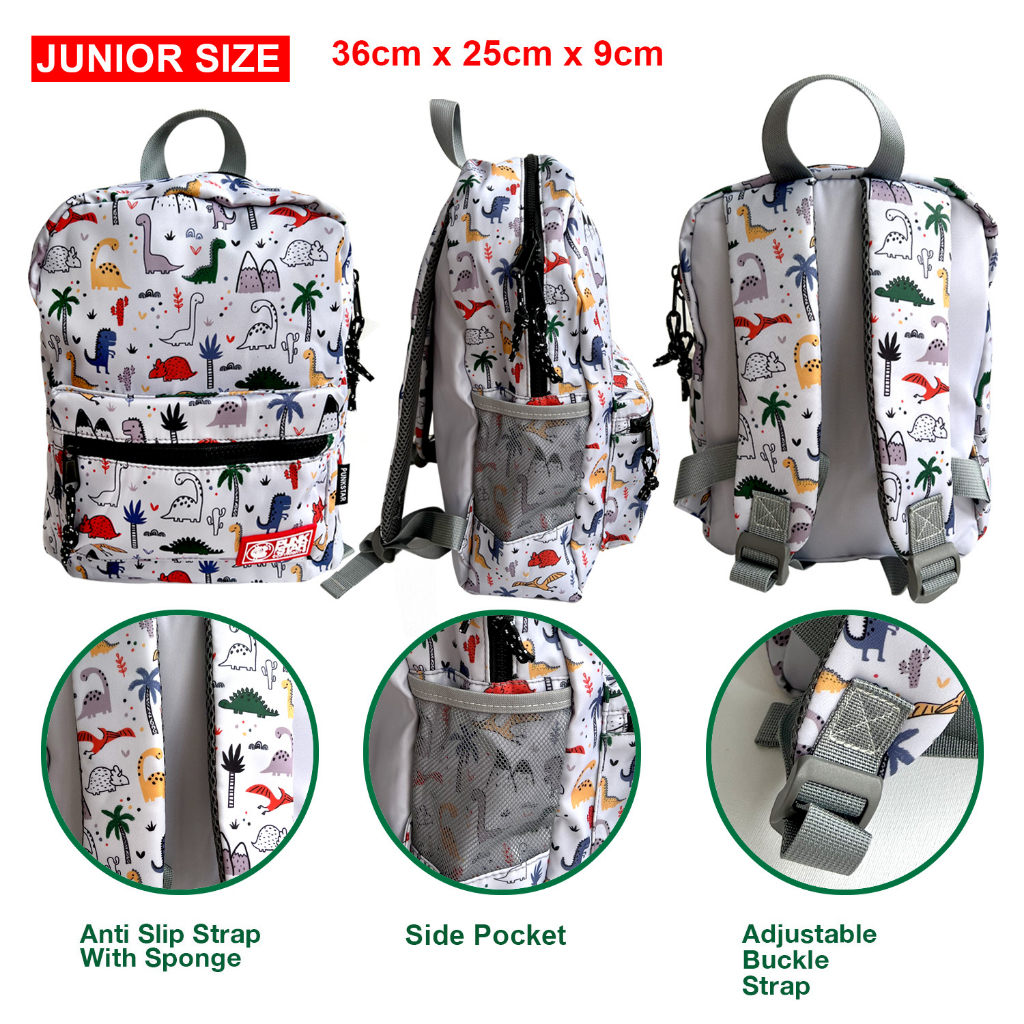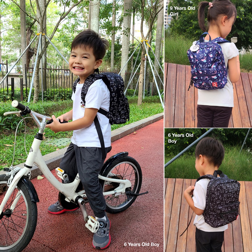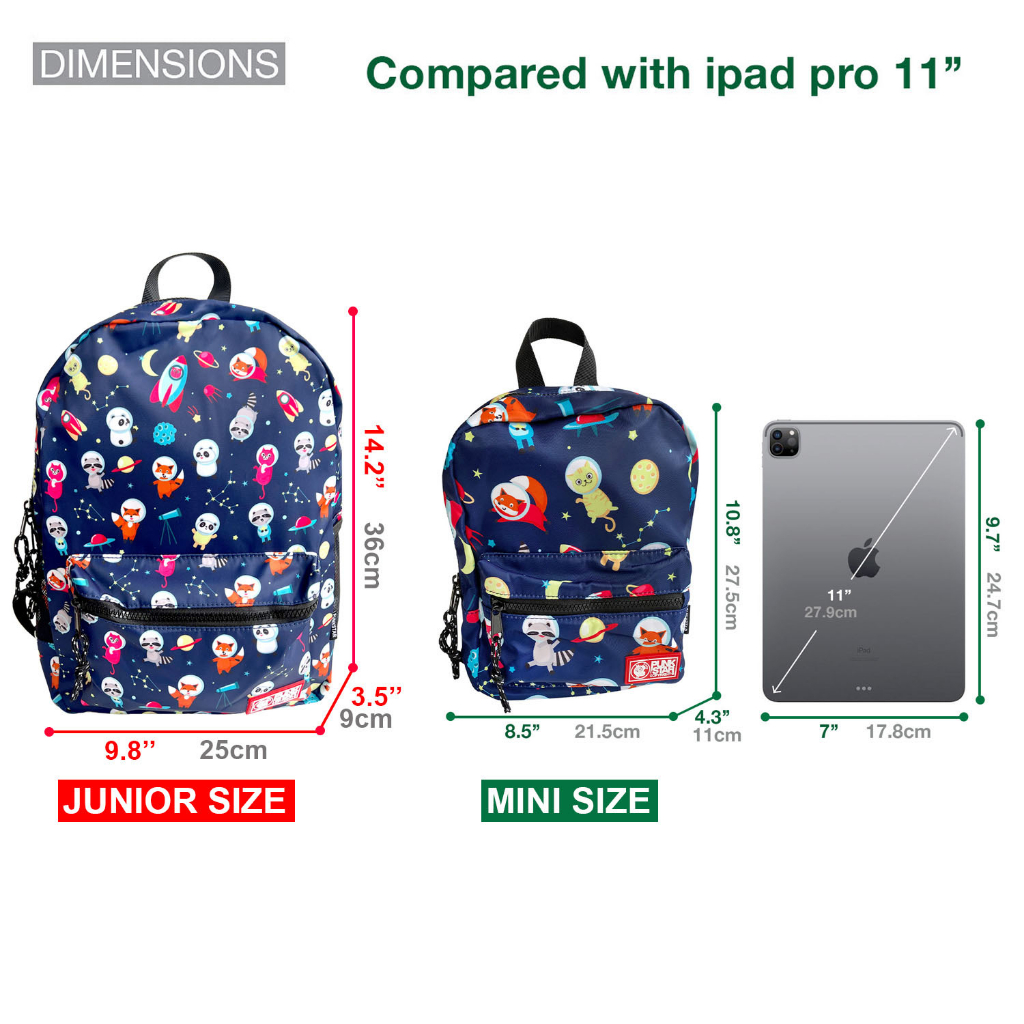 The Mini and Junior Size backpack are made of durable water-resistant polyester which is lightweight and easy to clean.The mini size backpack is perfect for toddlers going to preschool or play dates.The junior size backpack is suitable for primary school kids to carry for school or excursion. The adjustable padded shoulder straps offer support and comfort while the adjustable chest strap stabilizes the load throughout the day's activities.