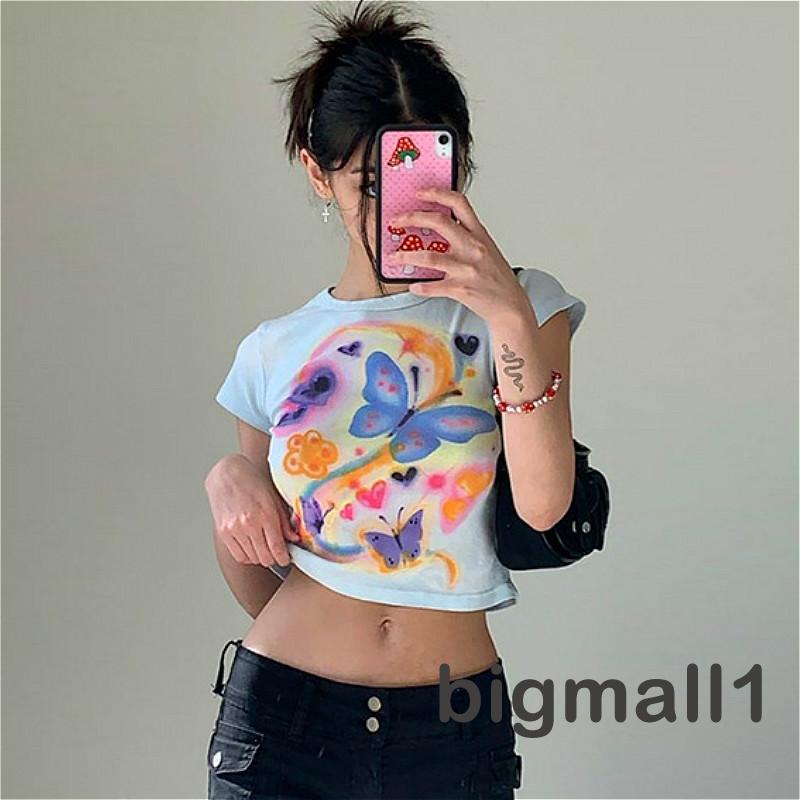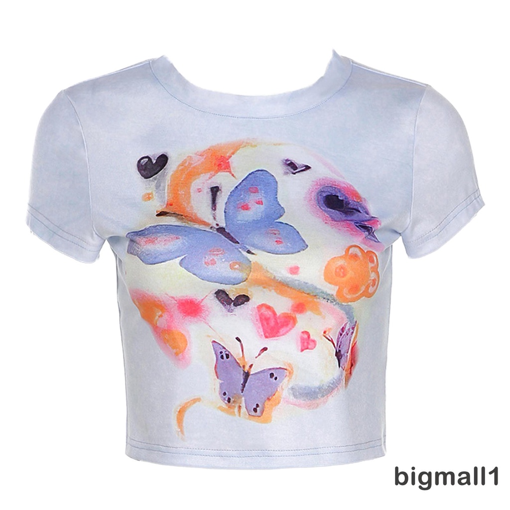 Features: Round Neck, Short Sleeve, Butterfly Tie Dye Print, Slim fit, Cropped Length. Casual female t-shirt, suitable for summer, spring, and autumn.