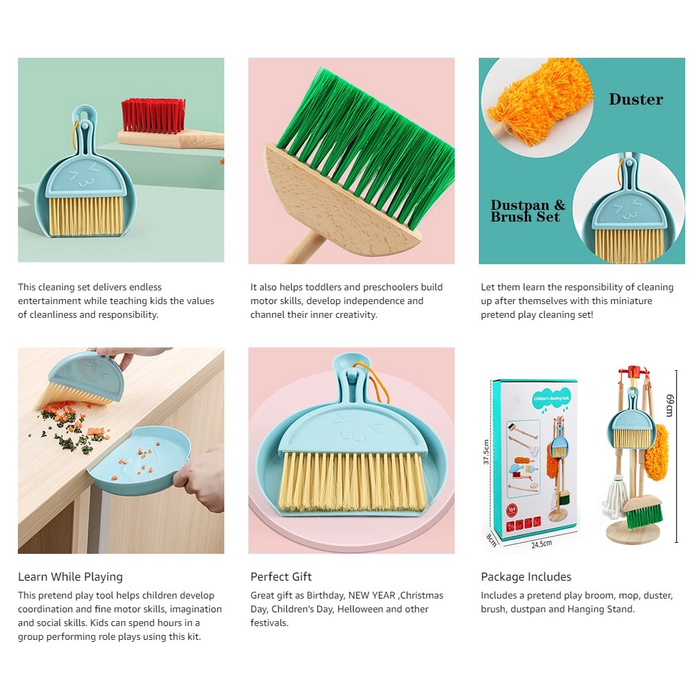 GREAT FOR AGES 3-6, includes 5pc of Broom, Duster, Rag, Brush, Dustpan and Storage Stand