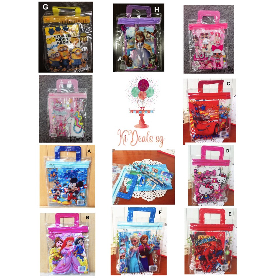 Consist of 1 handbag, 1 pencil, 1 sharpener, 1 eraser, 1 ruler, 1 notebook