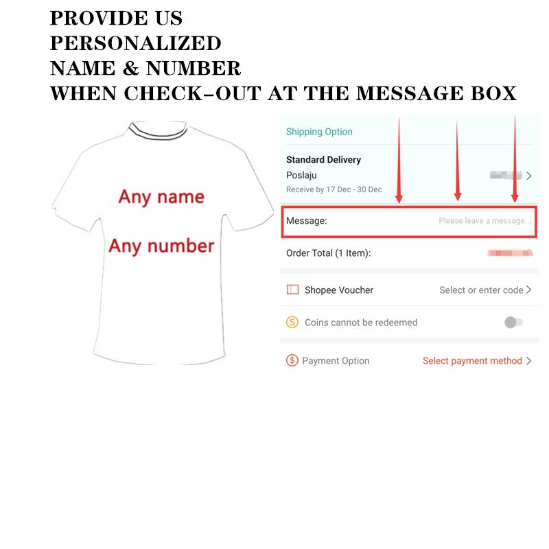 If you need to customize your name and number, please select [Add name number] to order, and then leave the name and number you need in the order, or you can tell us the name and number you need to add in shopee Chat.