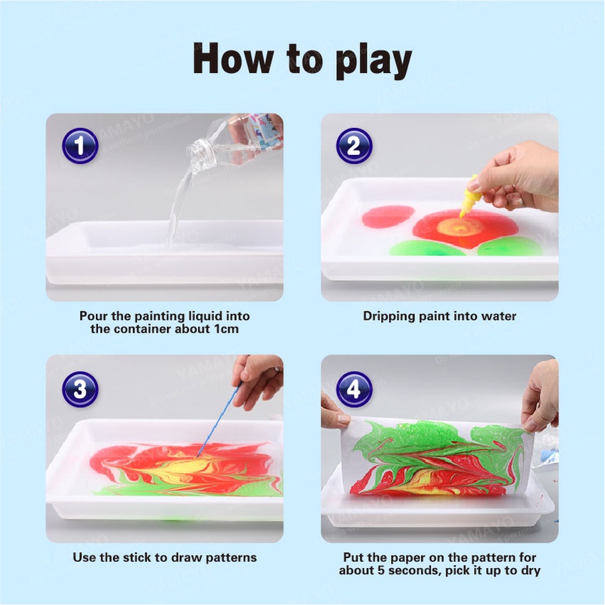 The marbling paint can help to develop kids’ color cognition, artistic cognition, and enhance their hand-on ability, imagination and creativity.