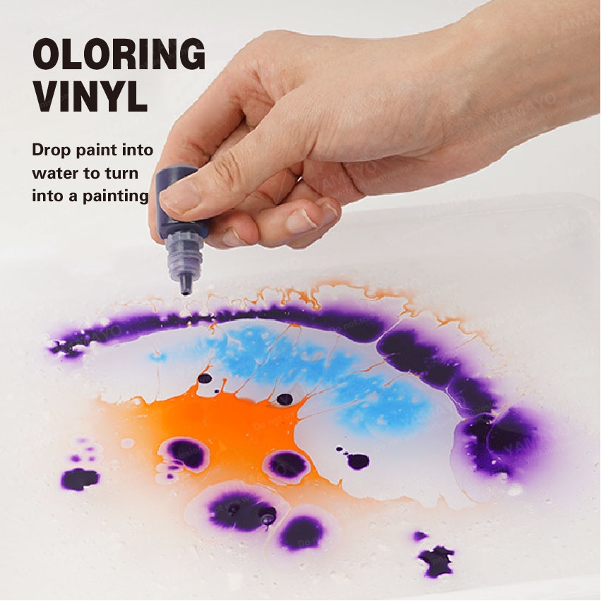 *Keep the mouth of the bottle paint 2cm away from liquid, and put a drop of dye on liquid