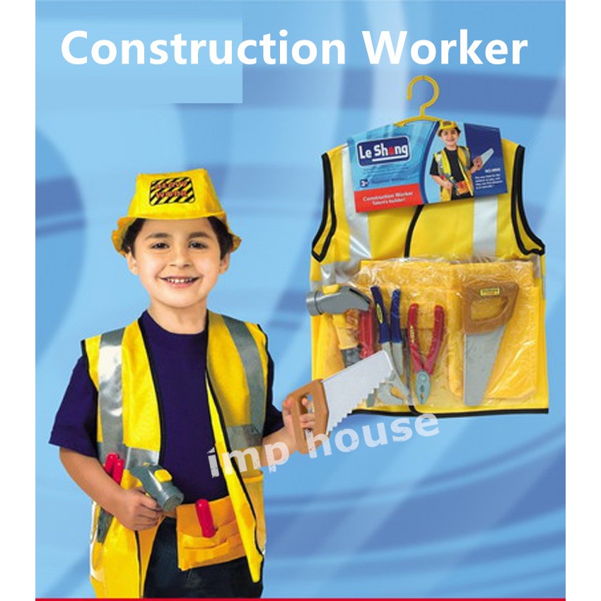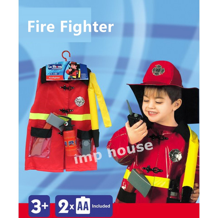 ☆ A fire hero set!☆ This fire fighter costume set includes with bright red jacket, helmet, fire extinguisher, walkie-talkie with sound effects, plastic axe, water gun and badge.